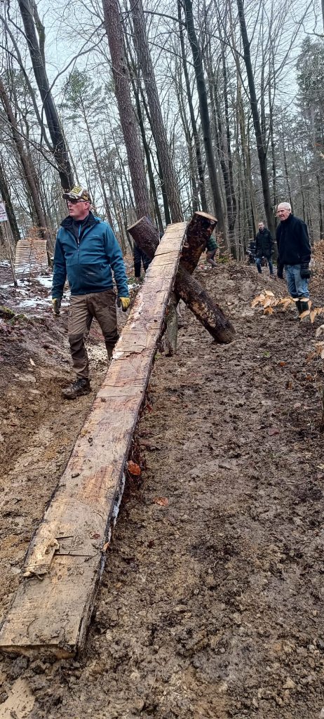 Florian hat heute den letzten Sprung auf der DH mit dem Bagger angelegt. Der Stamm für den Boner wurde an seinen vorgesehenen Platz gebracht und erhielt dort sein charakteristisches, X-förmiges Untergestell.
