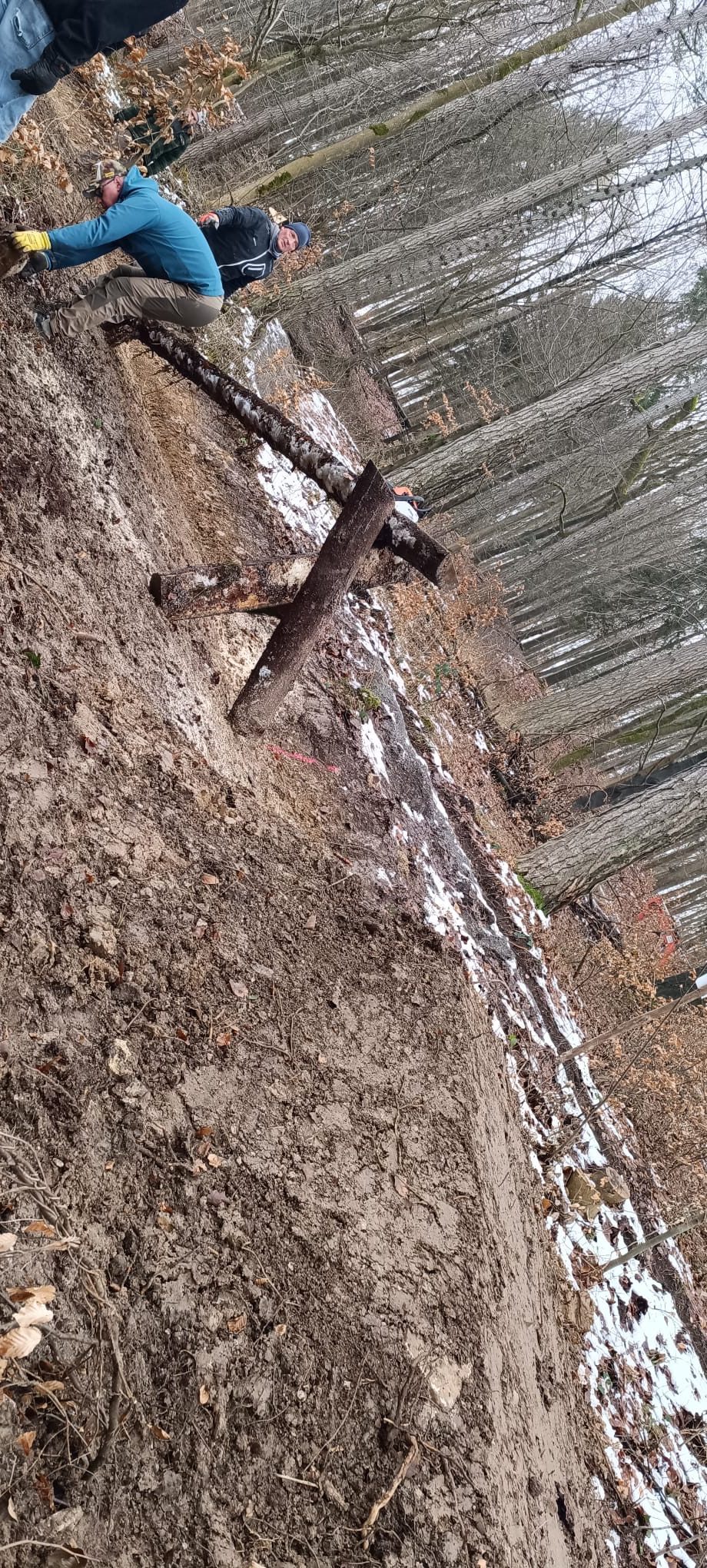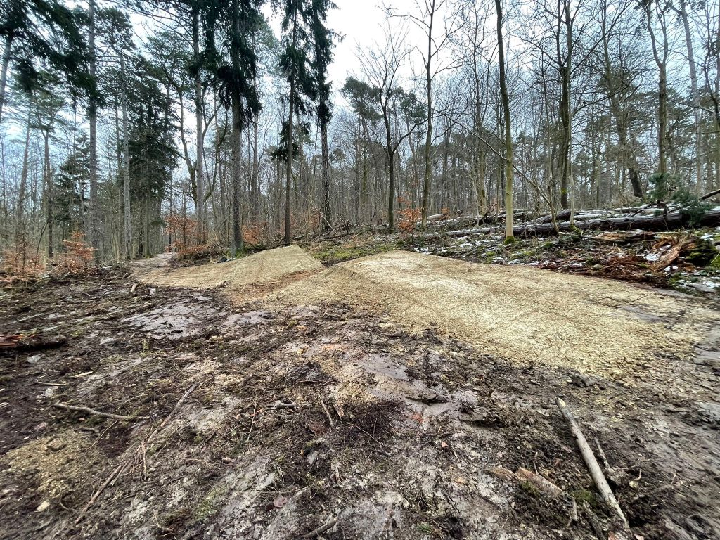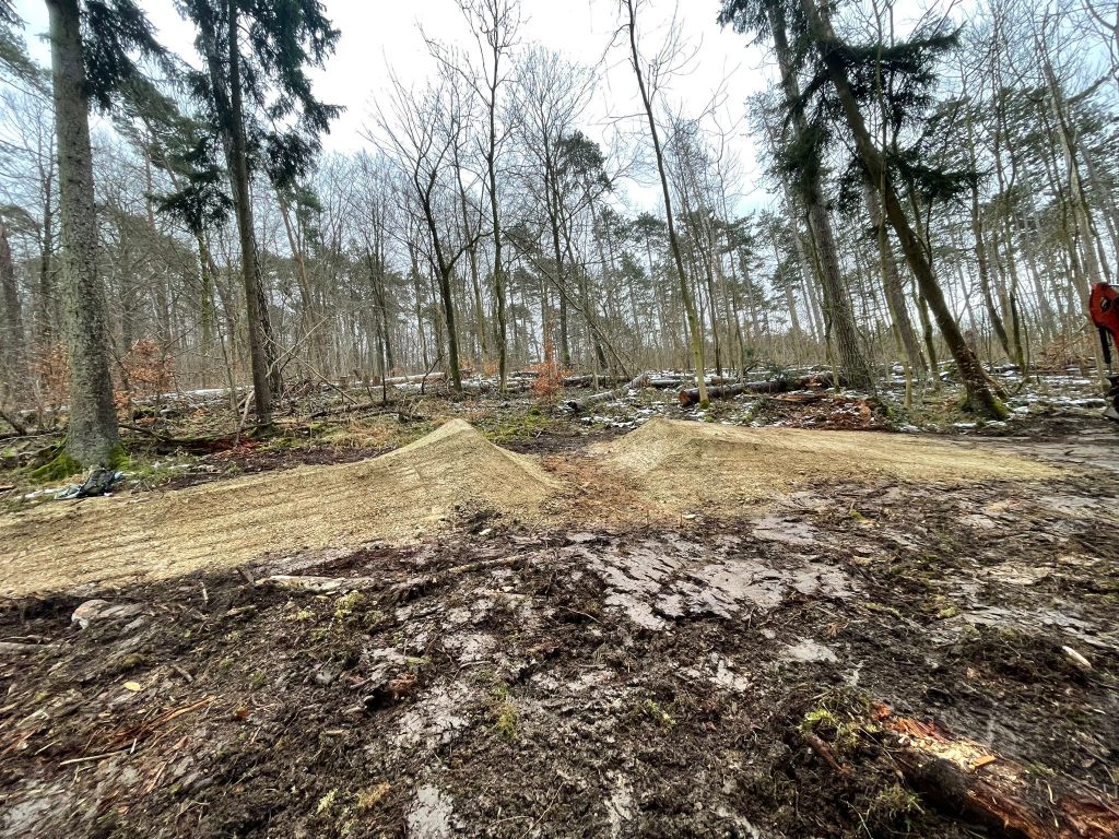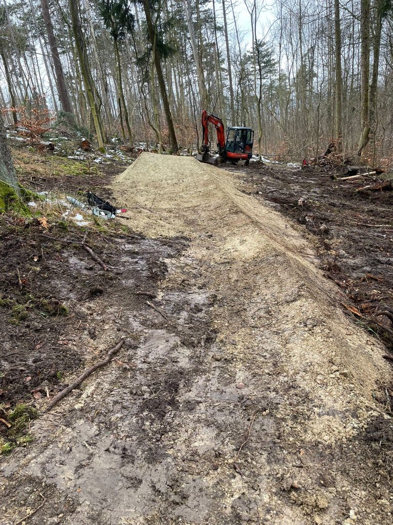 Nachdem die durch den Wind umgefallenen Baumstämme auf dem Flowtrail und dem Singletrail beseitigt wurden, haben wir heute mit dem Bau des hängenden Roadgaps auf der DH begonnen. Die Planung für einen Holzanlieger mit Sharkfin-Sprung nach dem Roadgap steht ebenfalls.