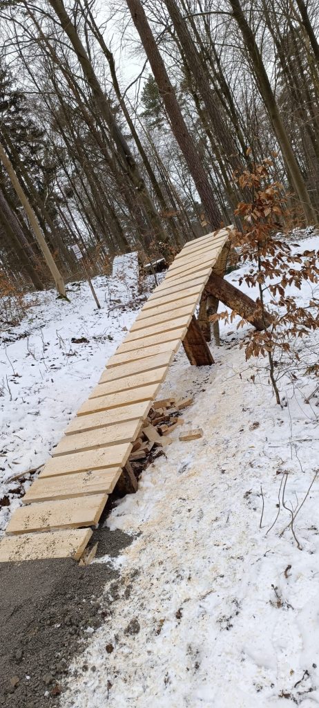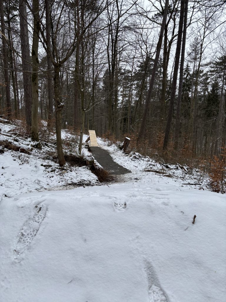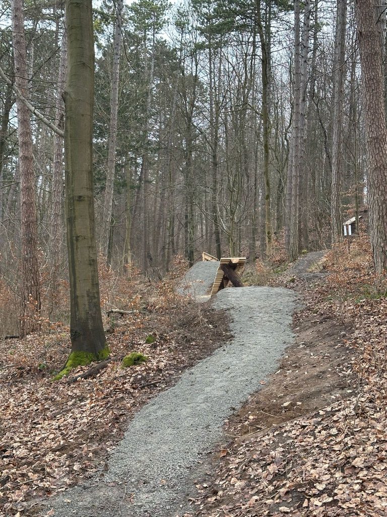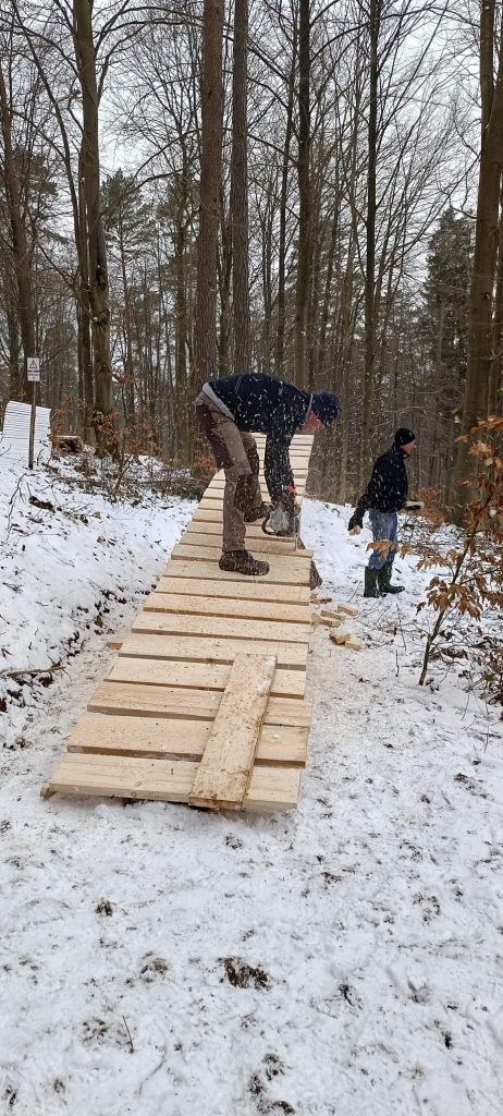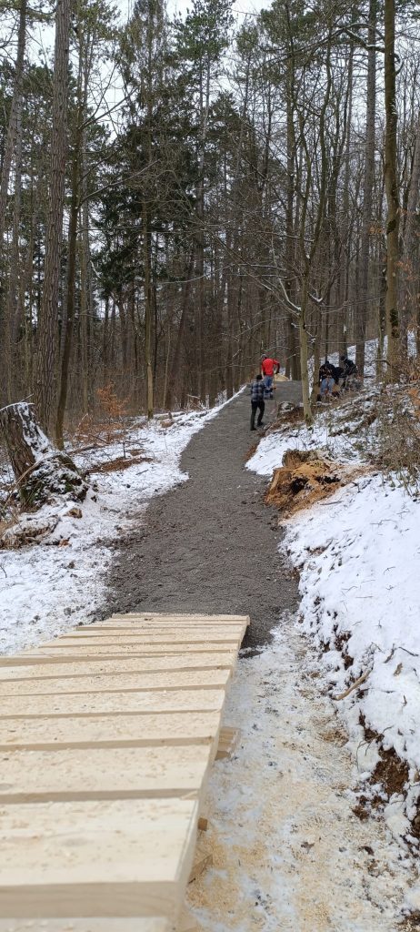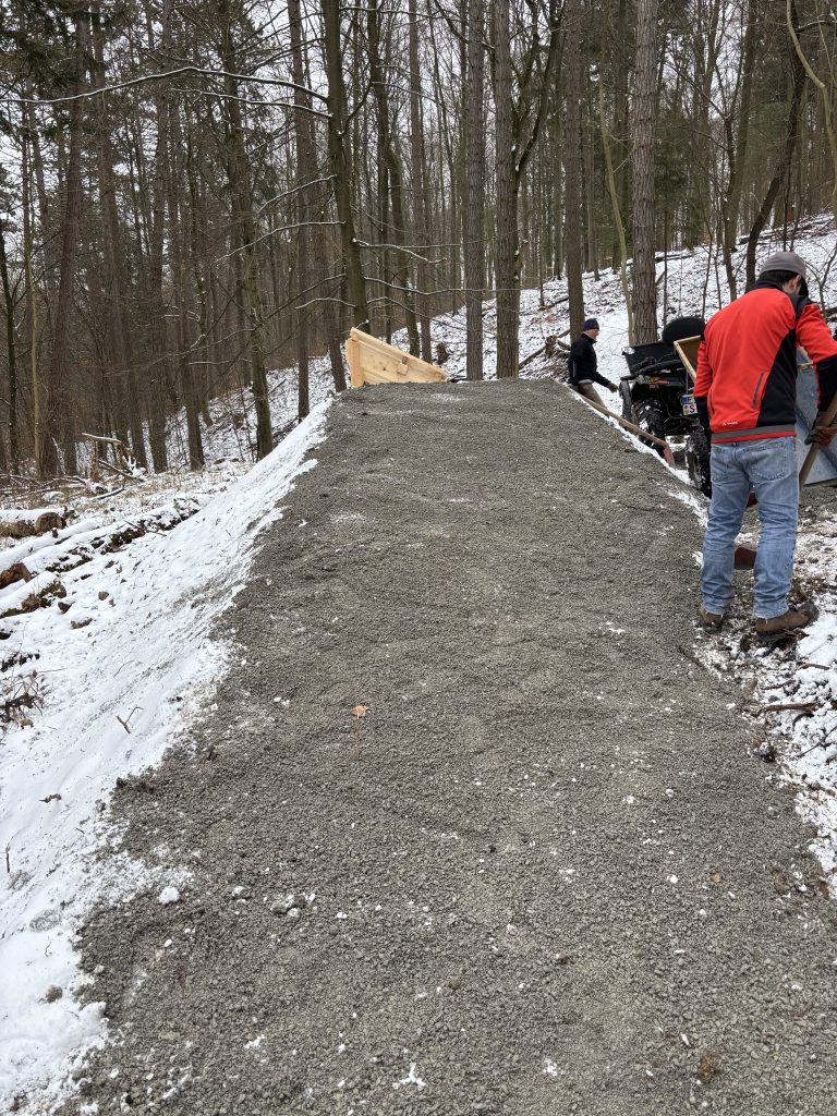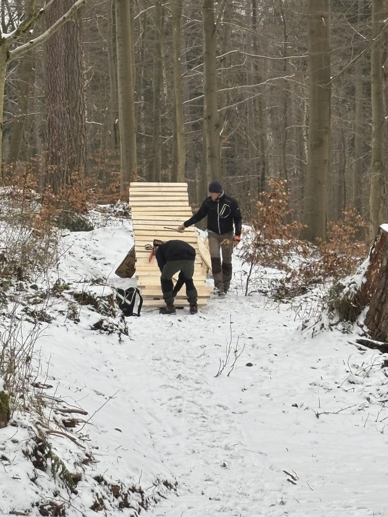 Trotz herausfordernder Witterungsbedingungen ging es heute auf der DH gut voran. Es wurden der Hip Jump und der Boner mit Holzbohlen beplankt und die Strecke zwischen beiden Elementen geschottert.