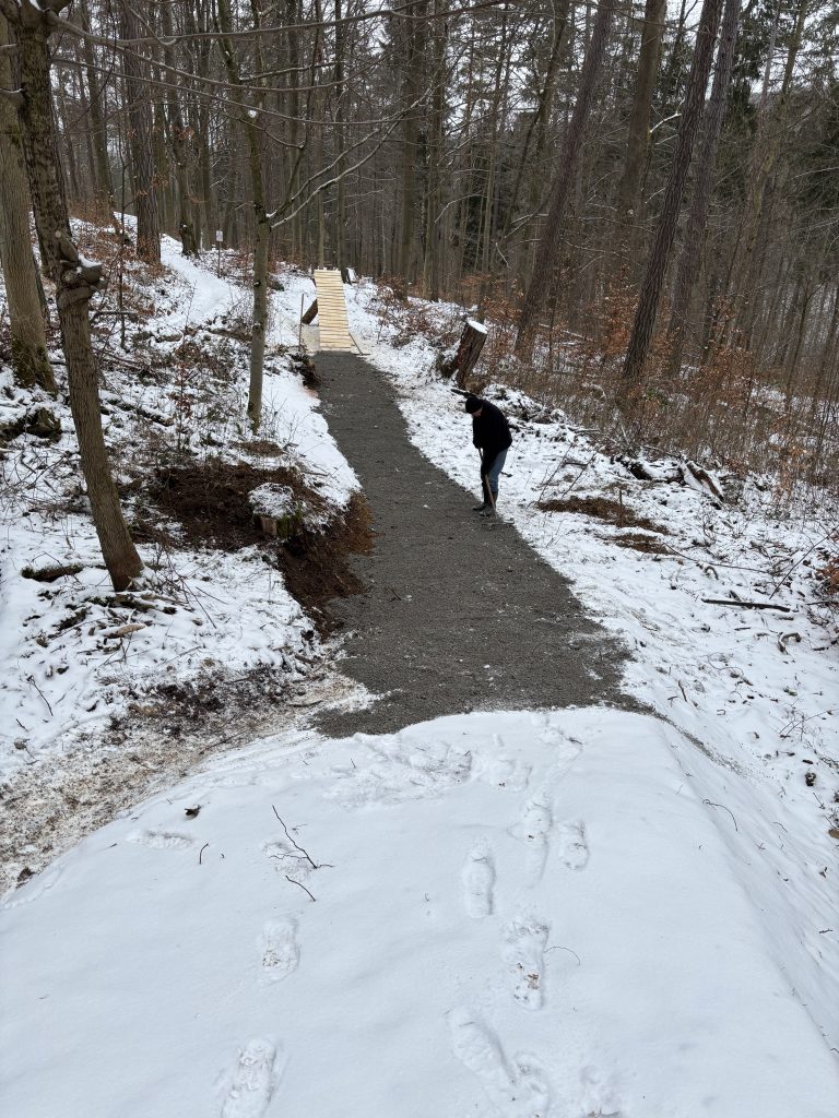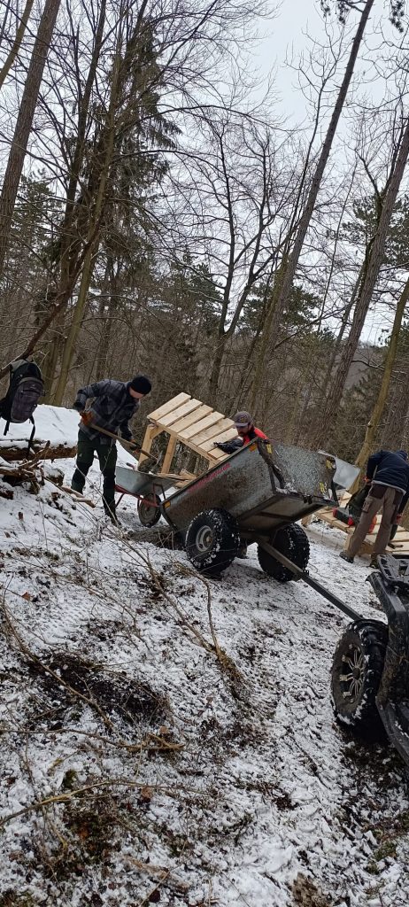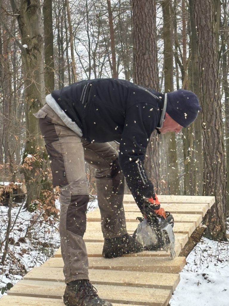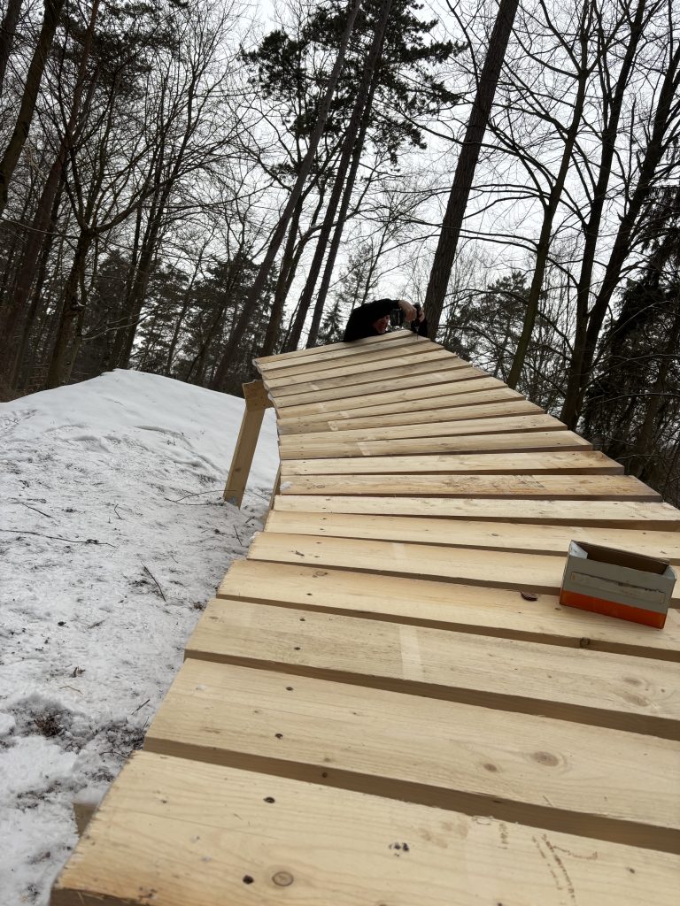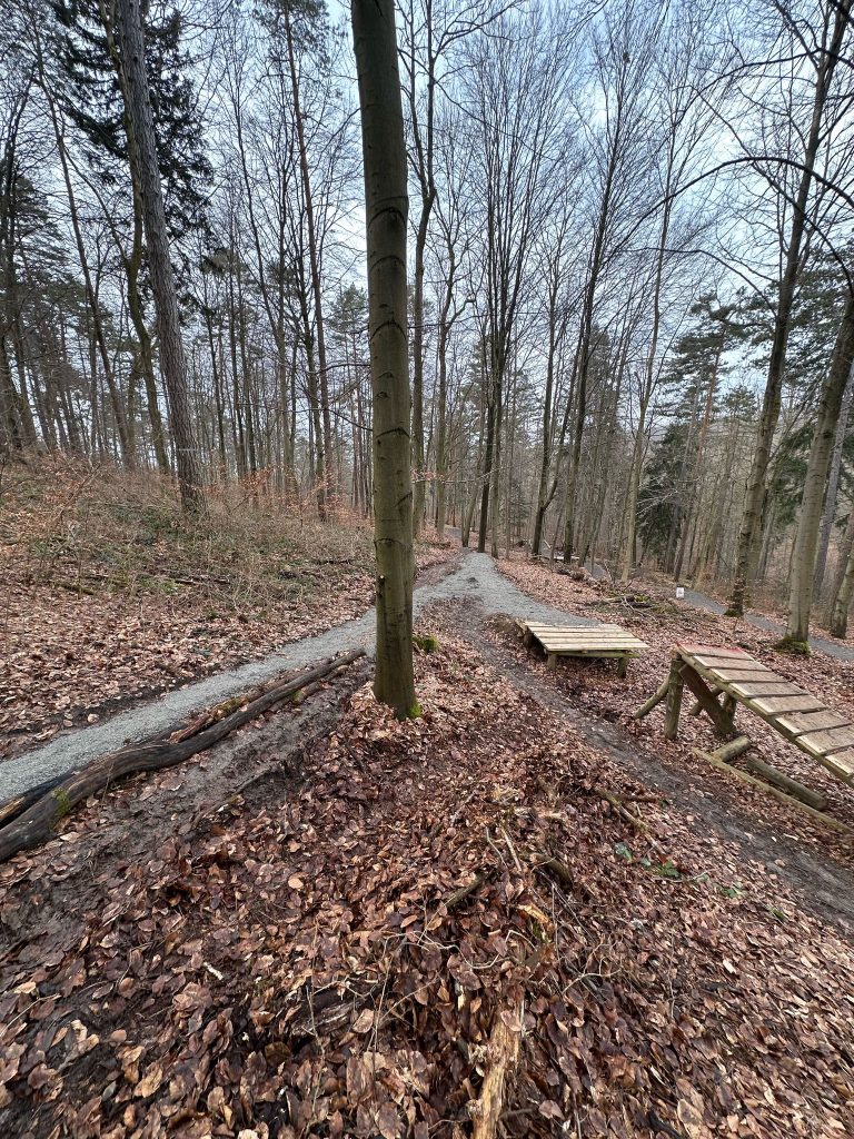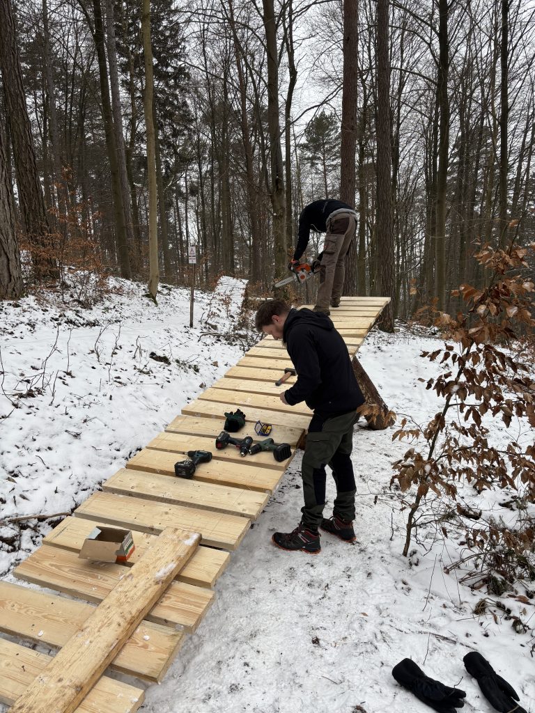 Trotz herausfordernder Witterungsbedingungen ging es heute auf der DH gut voran. Es wurden der Hip Jump und der Boner mit Holzbohlen beplankt und die Strecke zwischen beiden Elementen geschottert.