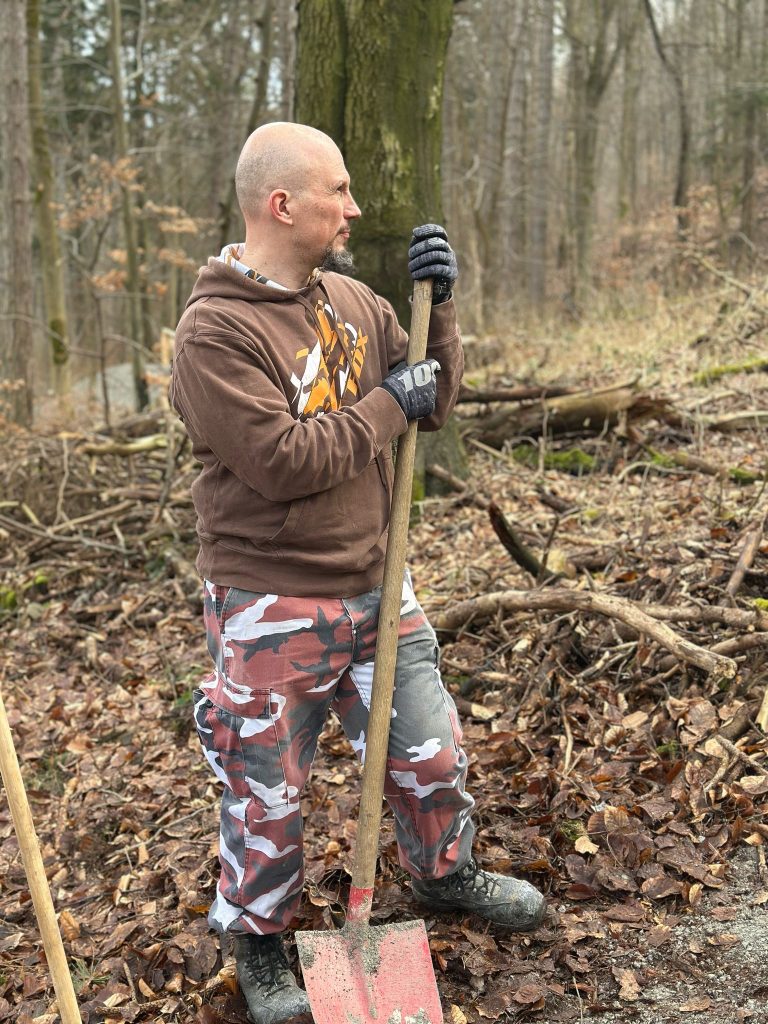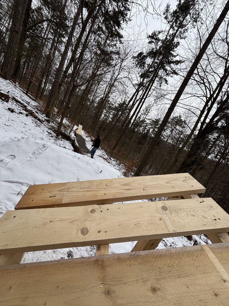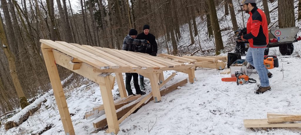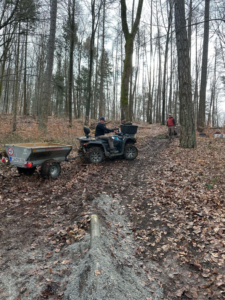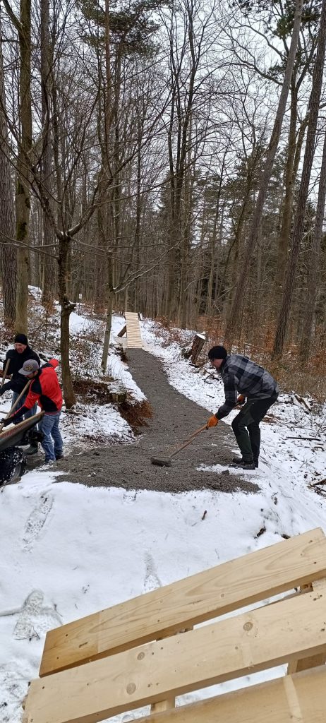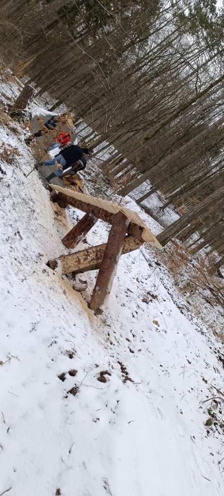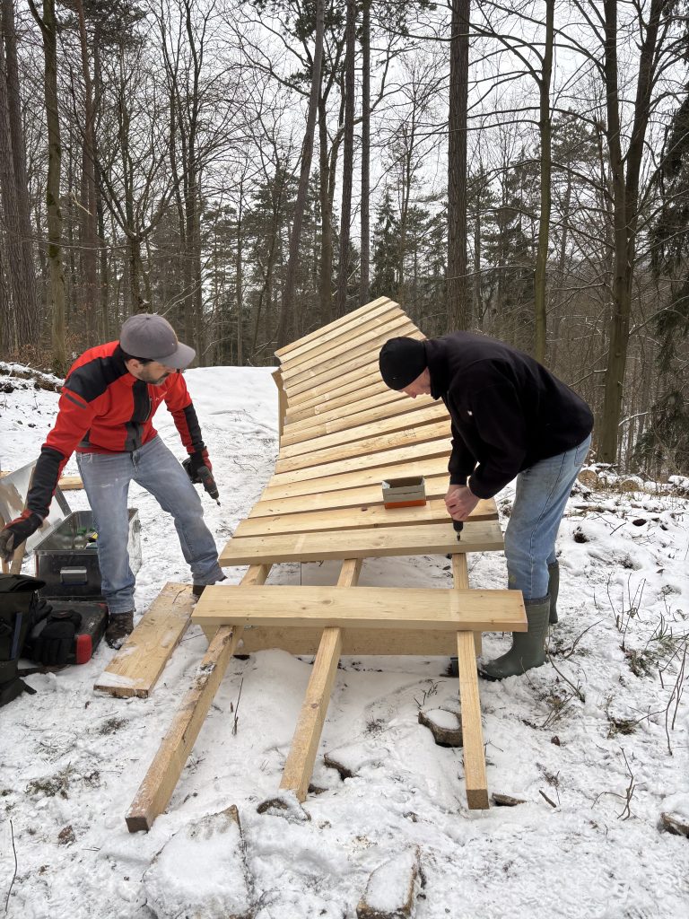 Trotz herausfordernder Witterungsbedingungen ging es heute auf der DH gut voran. Es wurden der Hip Jump und der Boner mit Holzbohlen beplankt und die Strecke zwischen beiden Elementen geschottert.