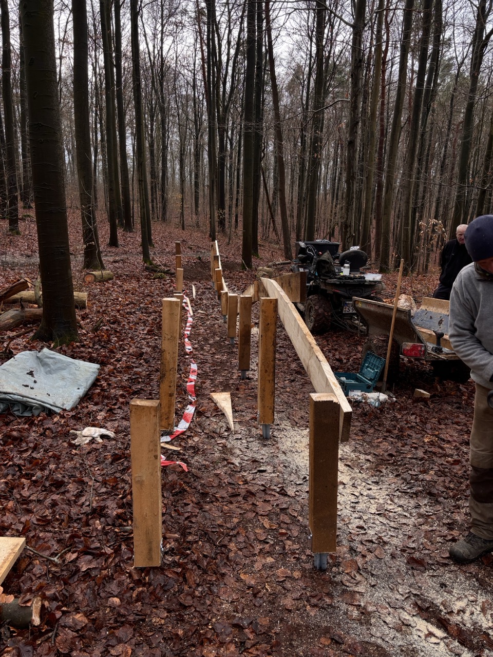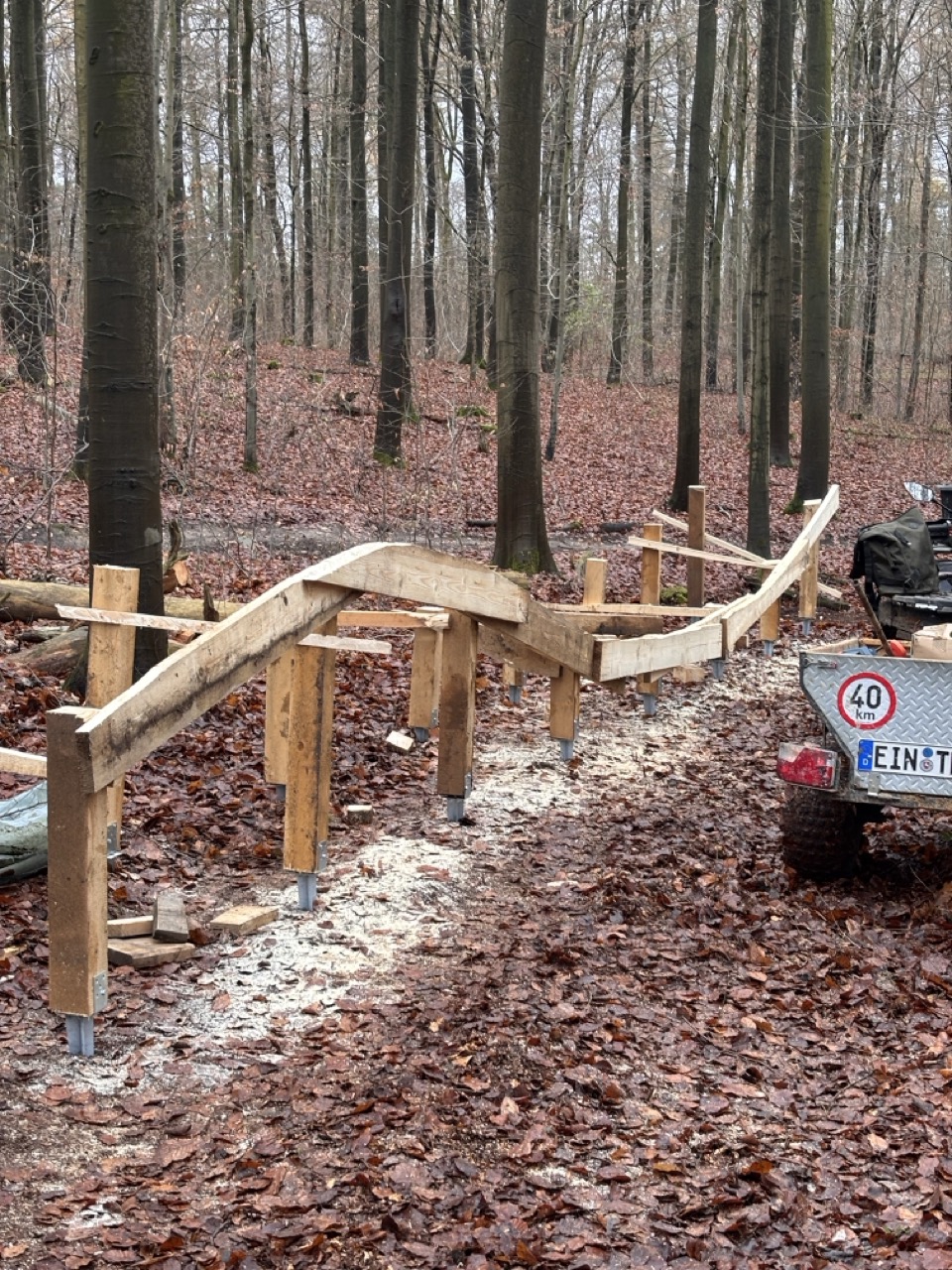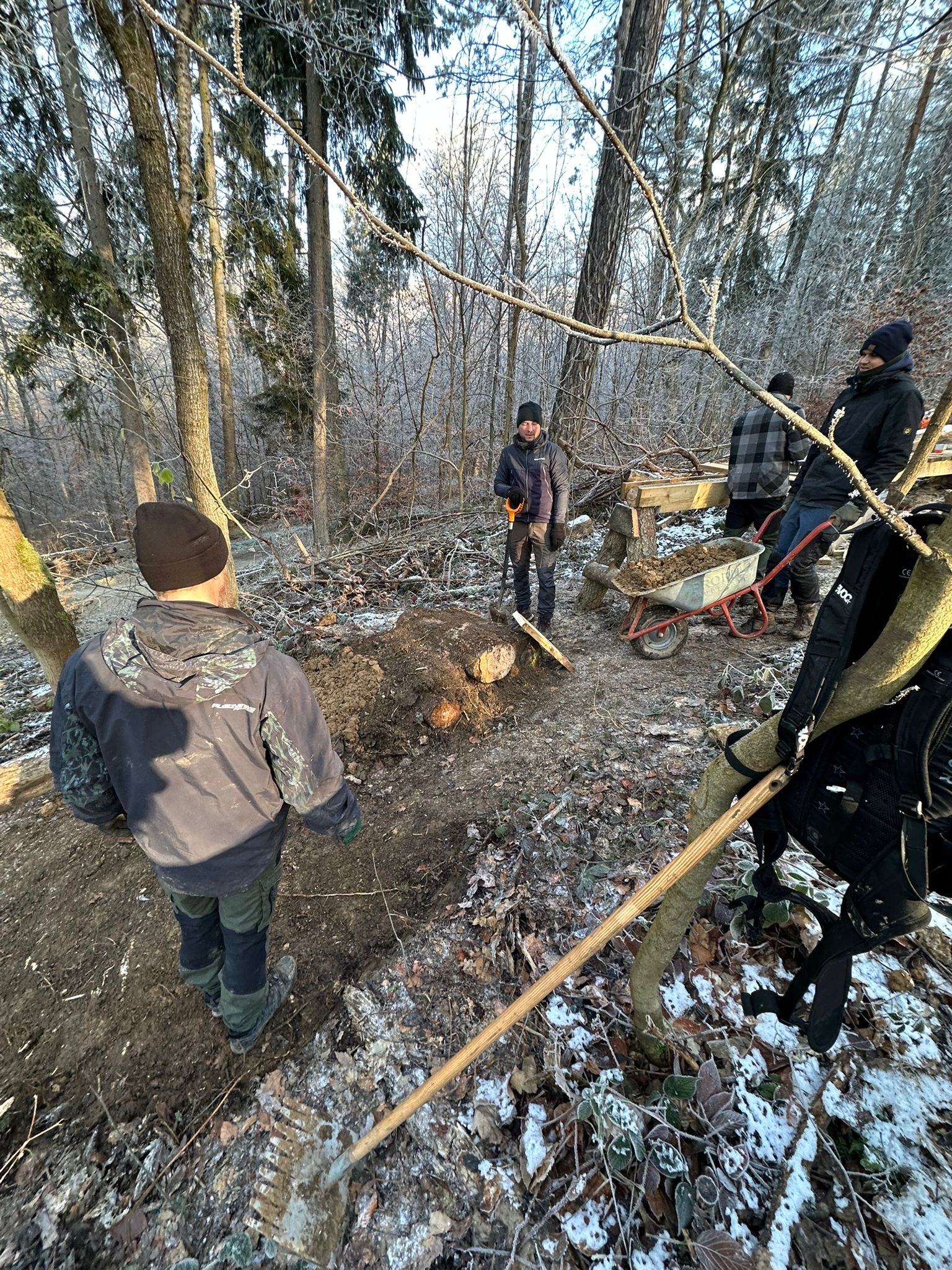 Heute hat die Trailcrew den Grundstein für das neue Whaletail-Element im oberen Abschnitt des Freeride-Trails gelegt. So kann an den kommenden Bautagen mit zahlreichen Helfern der Absprung, die Landung und der anschließende Anlieger entstehen.