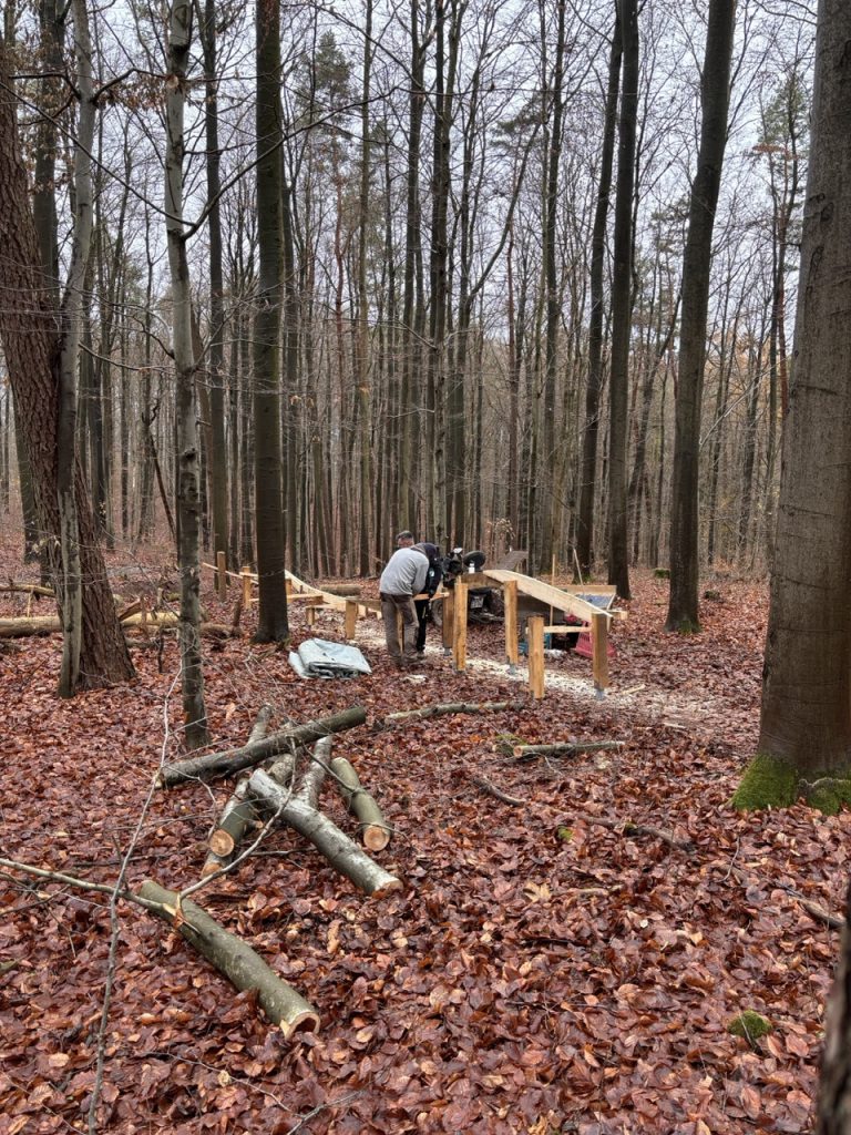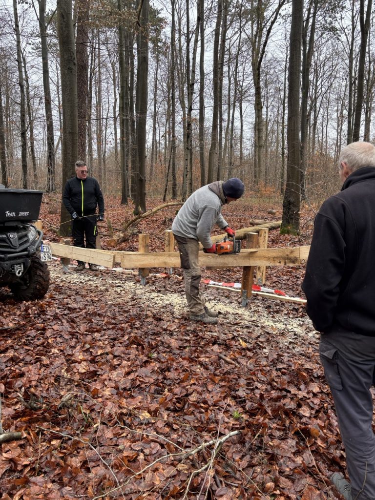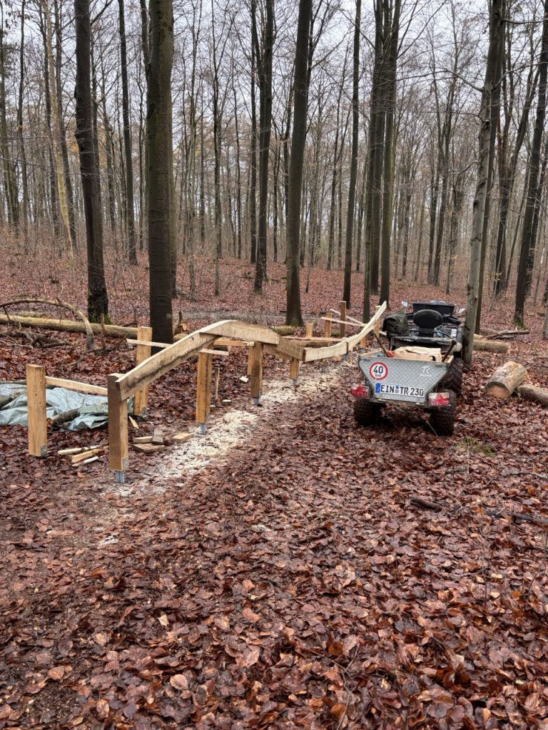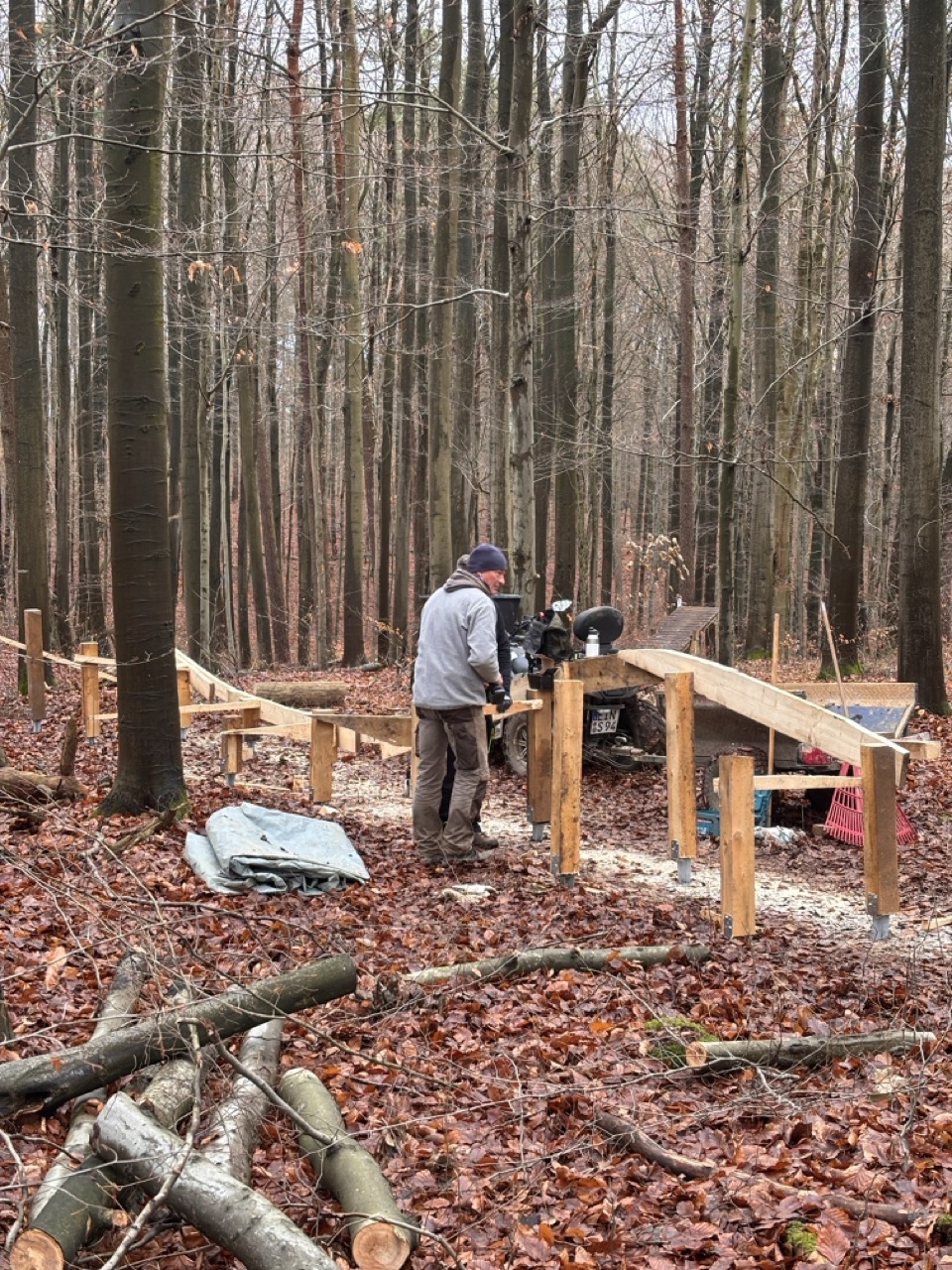 Heute hat die Trailcrew den Grundstein für das neue Whaletail-Element im oberen Abschnitt des Freeride-Trails gelegt. So kann an den kommenden Bautagen mit zahlreichen Helfern der Absprung, die Landung und der anschließende Anlieger entstehen.
