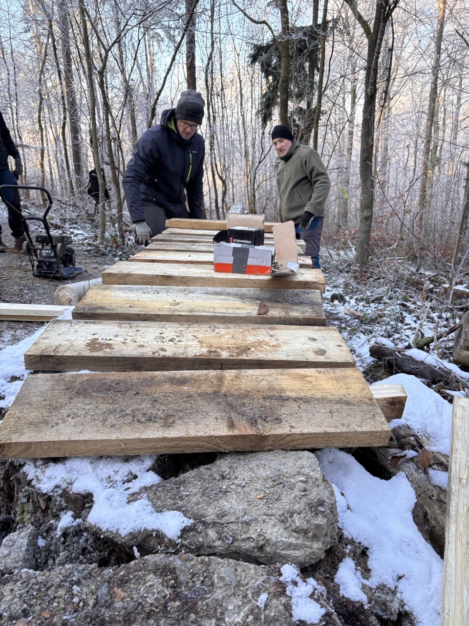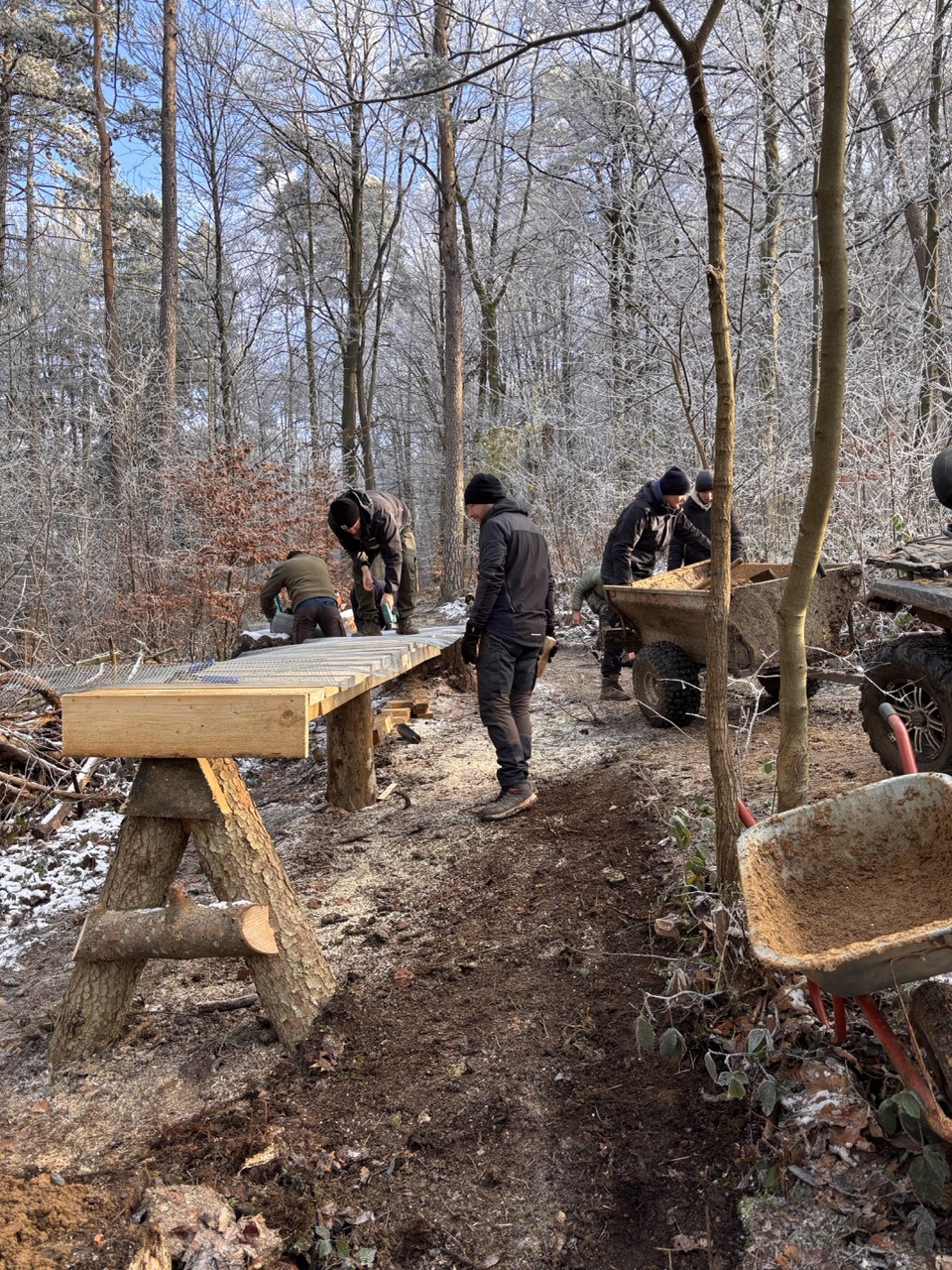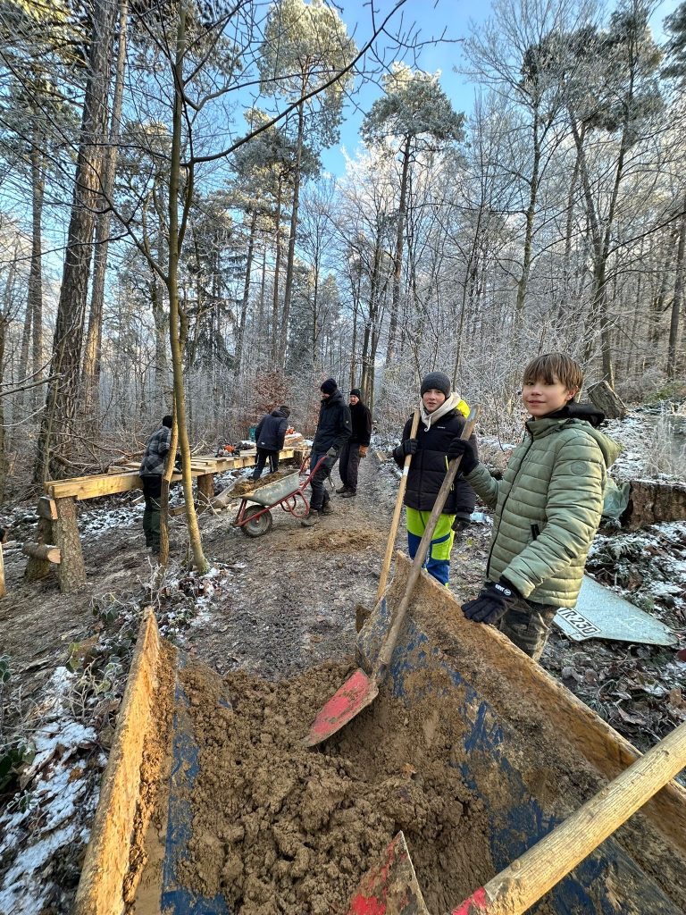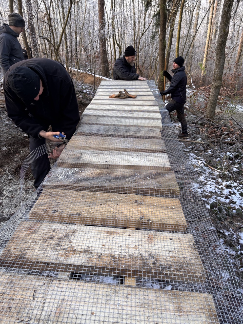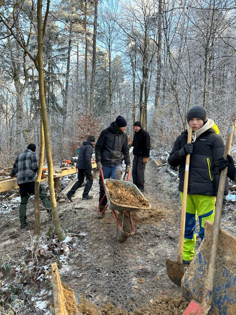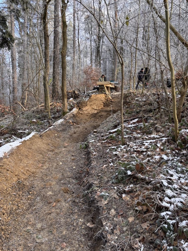 Der neue Boner hinter dem Steinfeld auf der Enduro wurde beplankt und mit Hasendraht rutschsicher gemacht. Zudem haben wir in den darauffolgenden Anlieger noch etwas Material eingebracht und versucht die festgefrorene Erde zu shapen. Der finale Shape ist aber erst möglich, wenn es etwas wärmer ist. Am Ausgang des Anliegers entsteht bei den nächsten Bautagen noch ein Hip Jump.