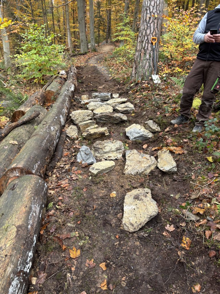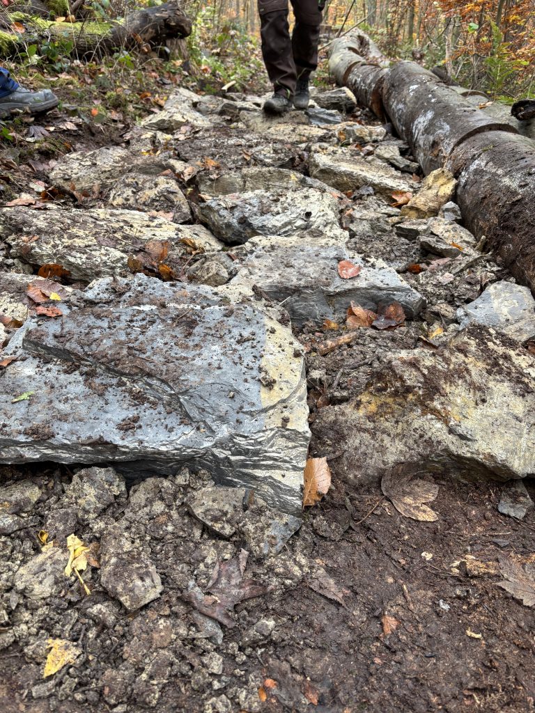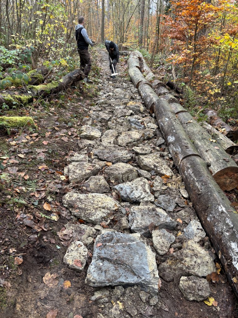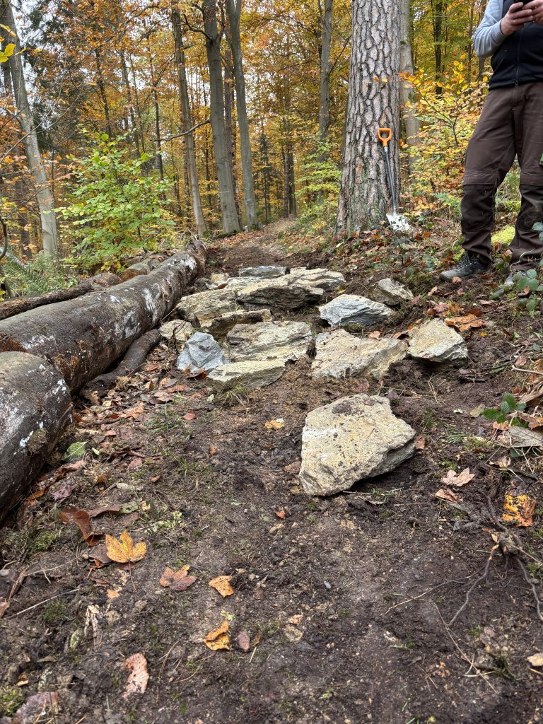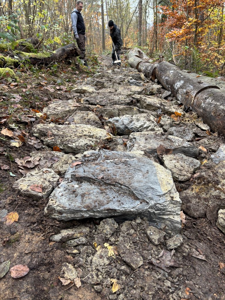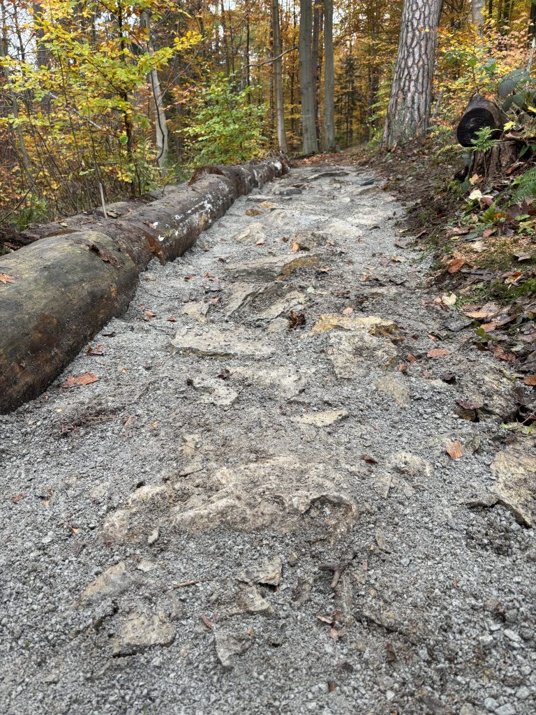 Das erste Stück Steinfeld auf der Enduro wurde angelegt. An der Stelle gab es nach Regen immer Probleme mit Matsch und großen Pfützen. An den kommenden Bautagen wird es noch ein Stück verlängert.