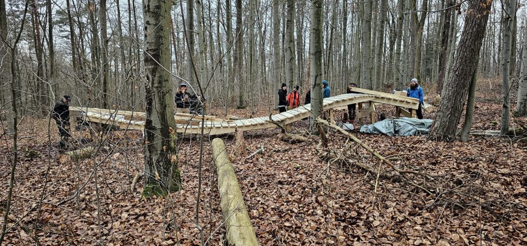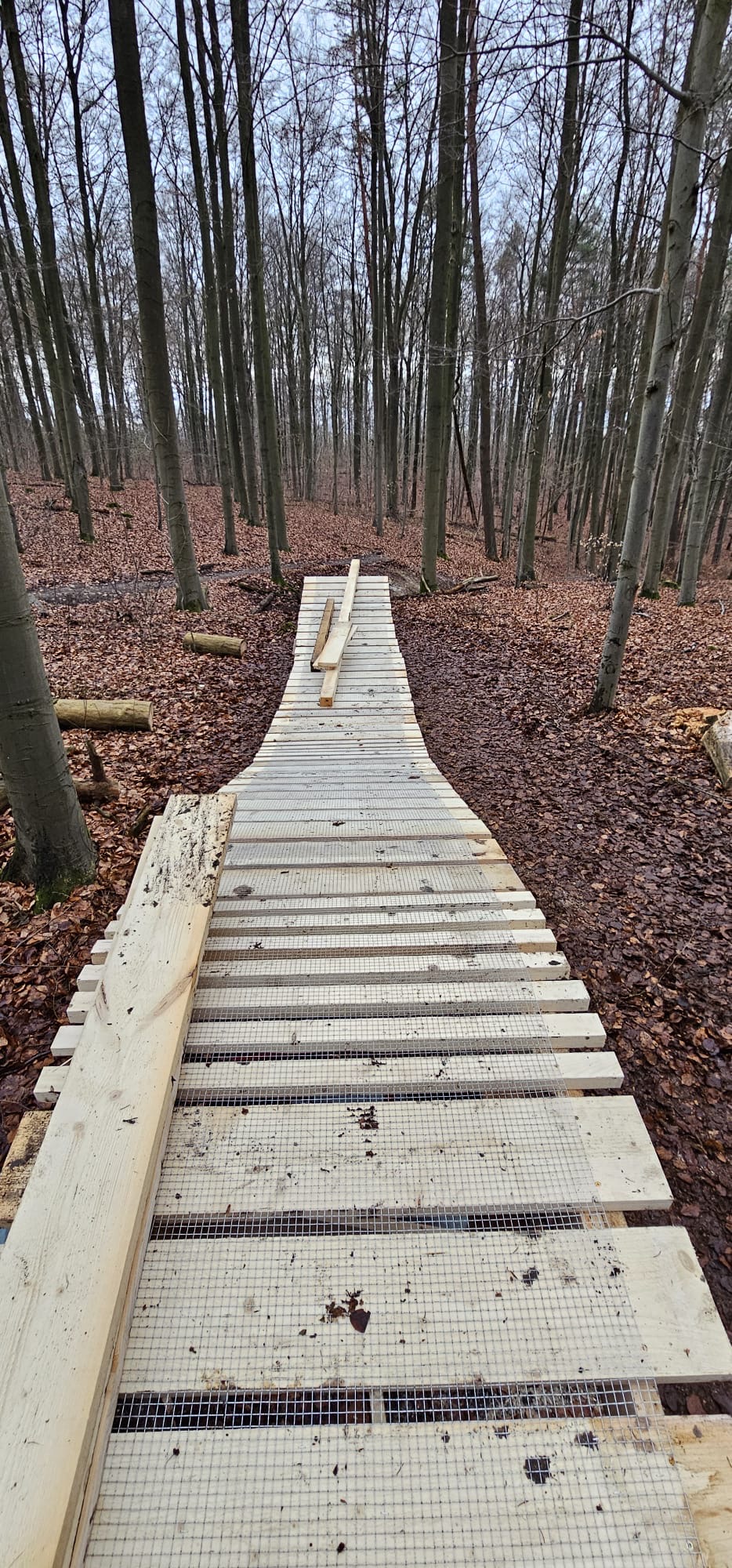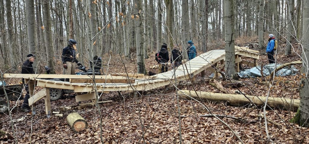 Der neue Boner hinter dem Steinfeld auf der Enduro wurde beplankt und mit Hasendraht rutschsicher gemacht. Zudem haben wir in den darauffolgenden Anlieger noch etwas Material eingebracht und versucht die festgefrorene Erde zu shapen. Der finale Shape ist aber erst möglich, wenn es etwas wärmer ist. Am Ausgang des Anliegers entsteht bei den nächsten Bautagen noch ein Hip Jump.
