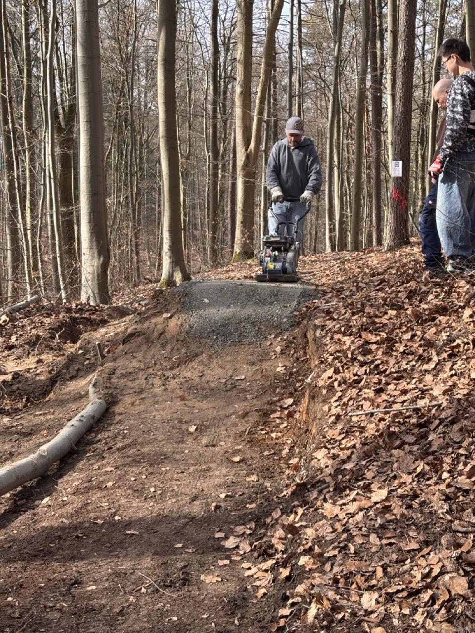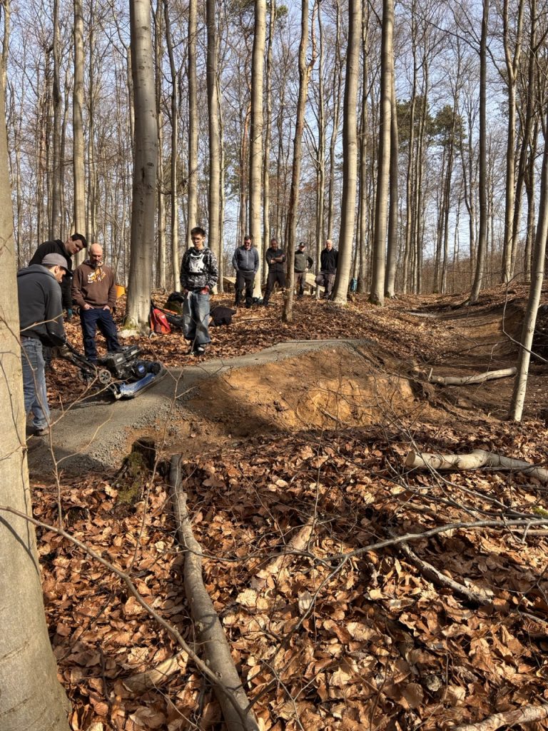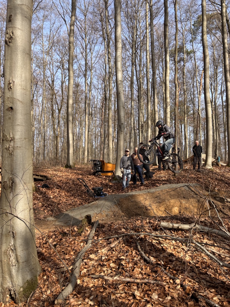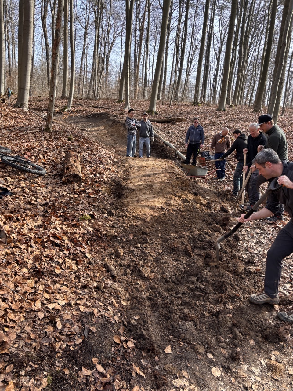 Durch die große Anzahl helfender Hände konnten wir heute gleich drei Baustellen abhaken. So konnten wir den Anlieger und den Hip‑Jump hinter dem Steinfeld auf der Enduro fertigstellen, einige Ausbesserungsarbeiten in der S‑Kurve auf dem Flowtrail durchführen und sogar noch einen ganz neuen Table nach dem Whale‑Tail auf der Freeride bauen.