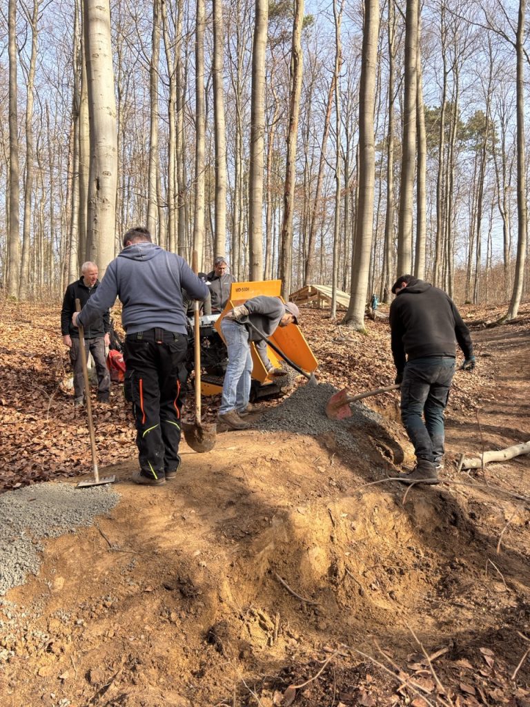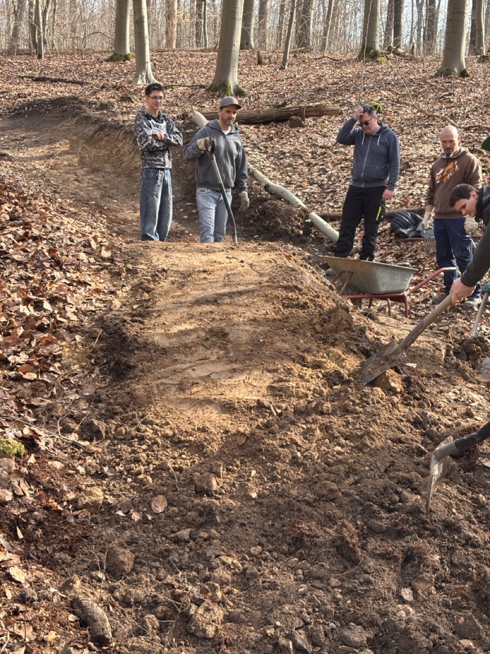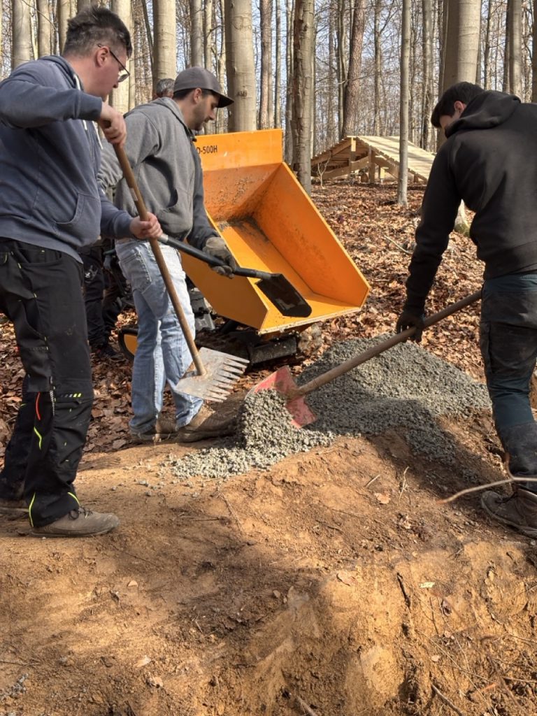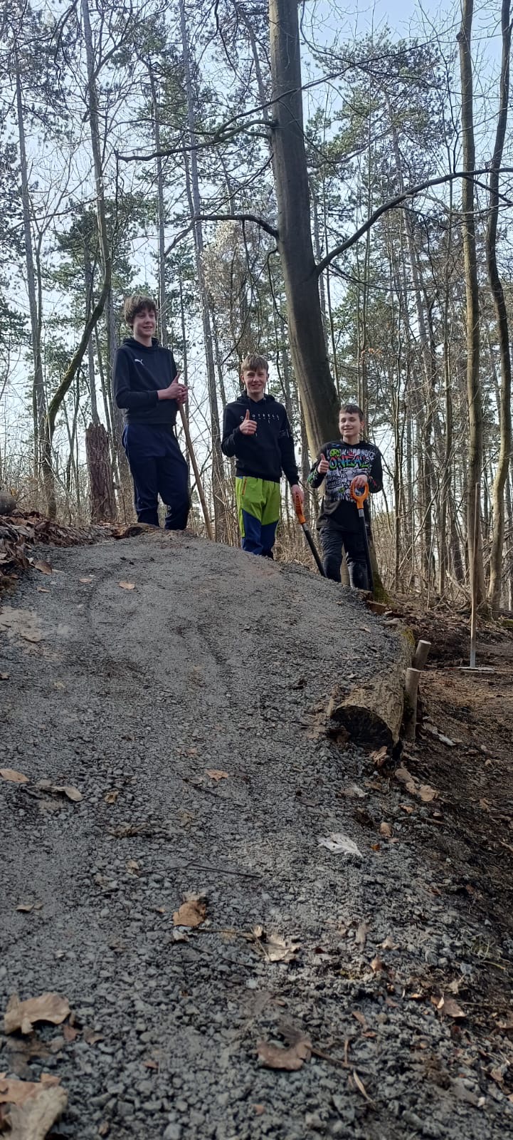 Durch die große Anzahl helfender Hände konnten wir heute gleich drei Baustellen abhaken. So konnten wir den Anlieger und den Hip‑Jump hinter dem Steinfeld auf der Enduro fertigstellen, einige Ausbesserungsarbeiten in der S‑Kurve auf dem Flowtrail durchführen und sogar noch einen ganz neuen Table nach dem Whale‑Tail auf der Freeride bauen.