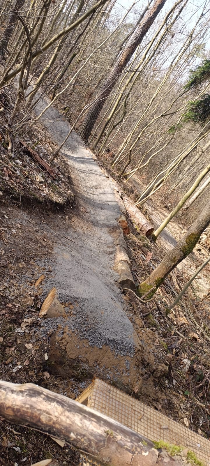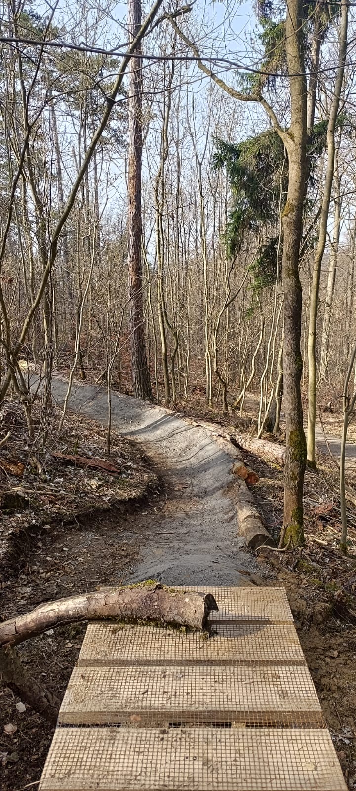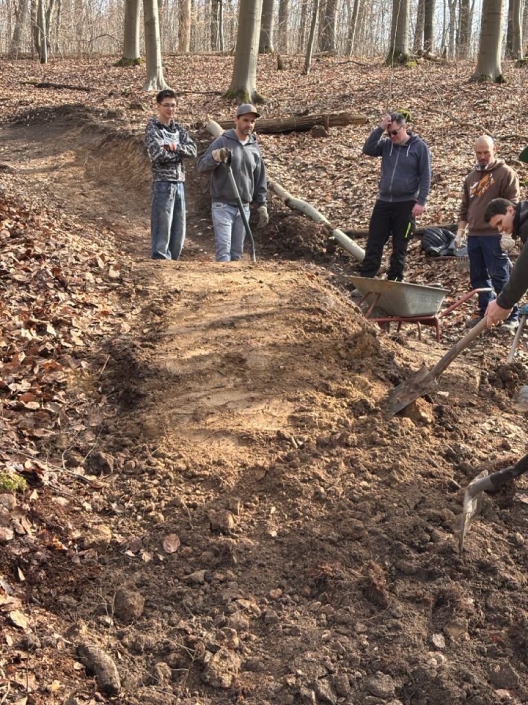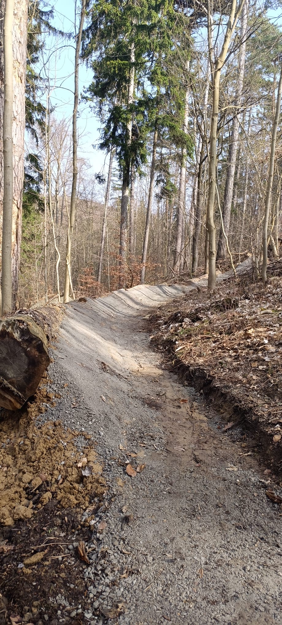 Durch die große Anzahl helfender Hände konnten wir heute gleich drei Baustellen abhaken. So konnten wir den Anlieger und den Hip‑Jump hinter dem Steinfeld auf der Enduro fertigstellen, einige Ausbesserungsarbeiten in der S‑Kurve auf dem Flowtrail durchführen und sogar noch einen ganz neuen Table nach dem Whale‑Tail auf der Freeride bauen.