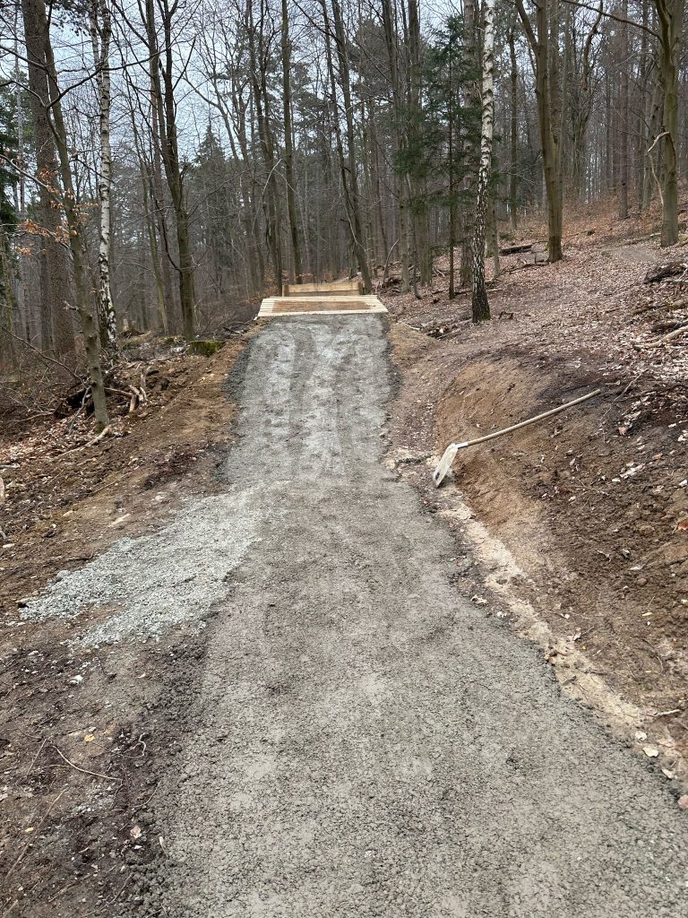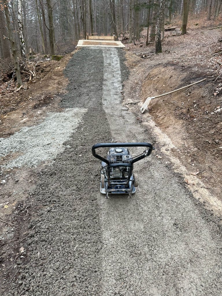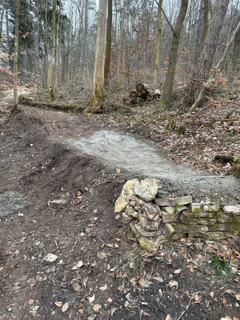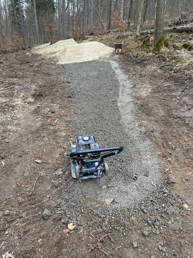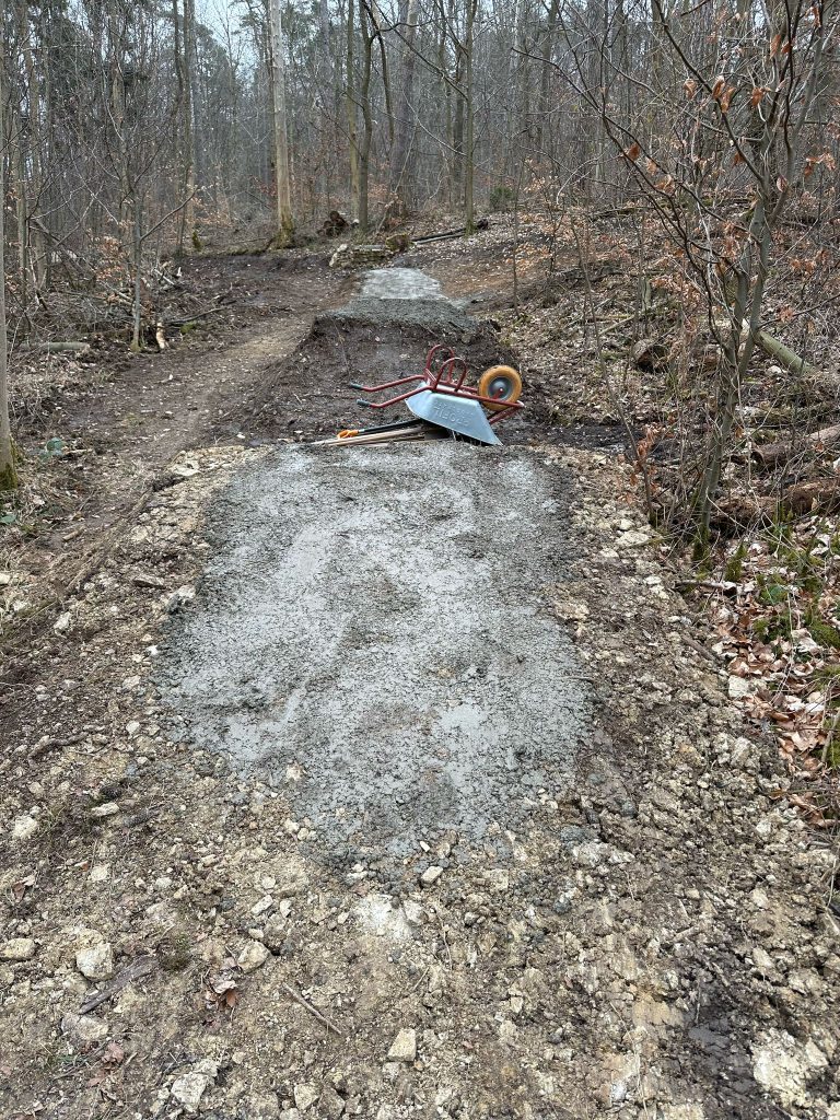 Heute wurde auf der neuen DH weiter geschottert. Leider hat der Anhänger vom Quad die Grätsche gemacht und so musste alles Material mit Schubkarren durch den Wald geschoben werden. 💪